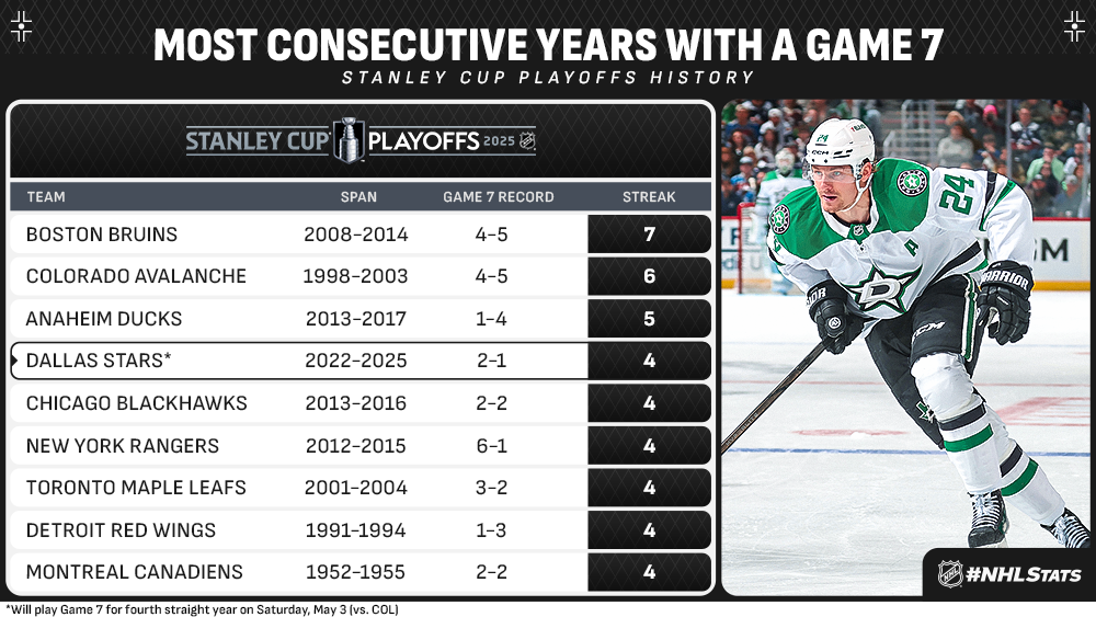 * Dallas will compete in a Game 7 for the fourth consecutive postseason (also 2024 R1, 2023 R2 & 2022 R1), the ninth different team in NHL history to do so and first since Anaheim in five straight years from 2013 to 2017.