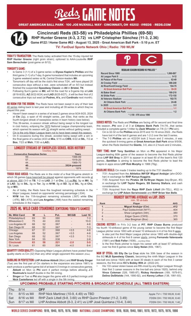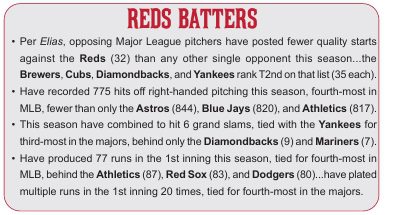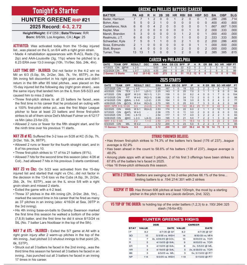 • With Hunter Greene back from IR, Reds looking to win series against Phillies tonight, 5:10 PM