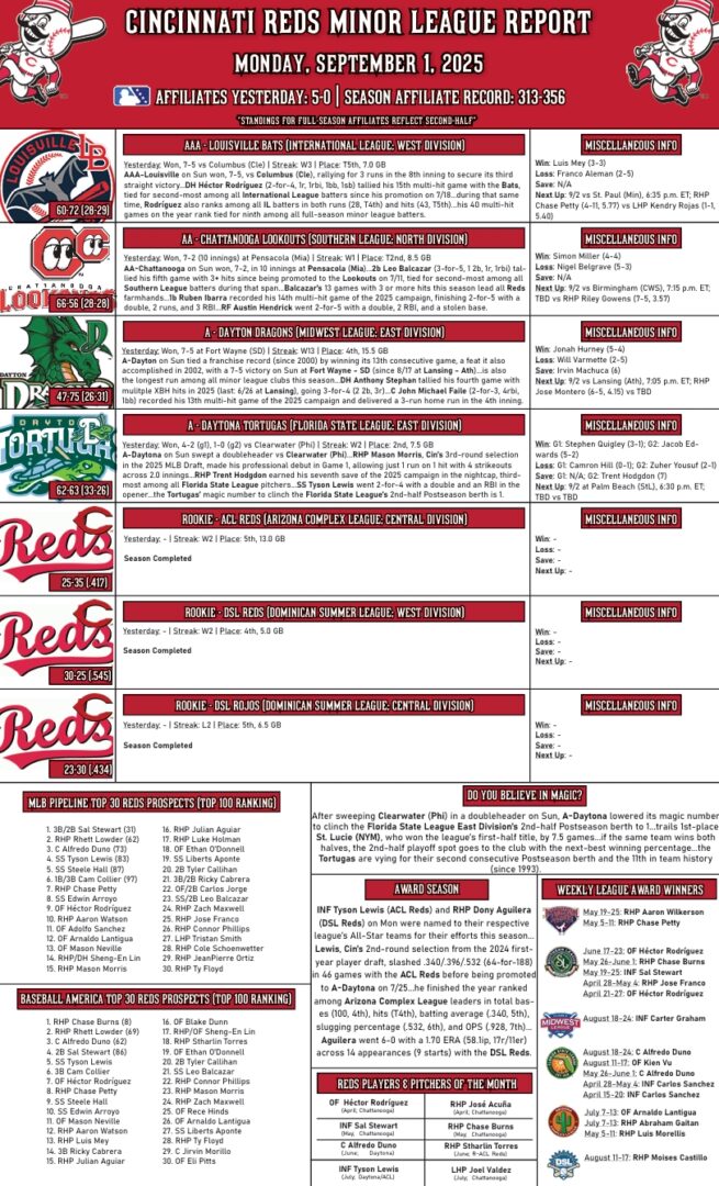Reds Minor League Report, September 1 2025 Posted on 8 months ago by admin By Evan Brent COURTESY REDS MEDIA RELATIONS Post navigation Previous article Reds Active Roster for Toronto seriesNext article Guardians in Beantown on Labor Day taking on Playoff pushing Red Sox, 1:35 PM