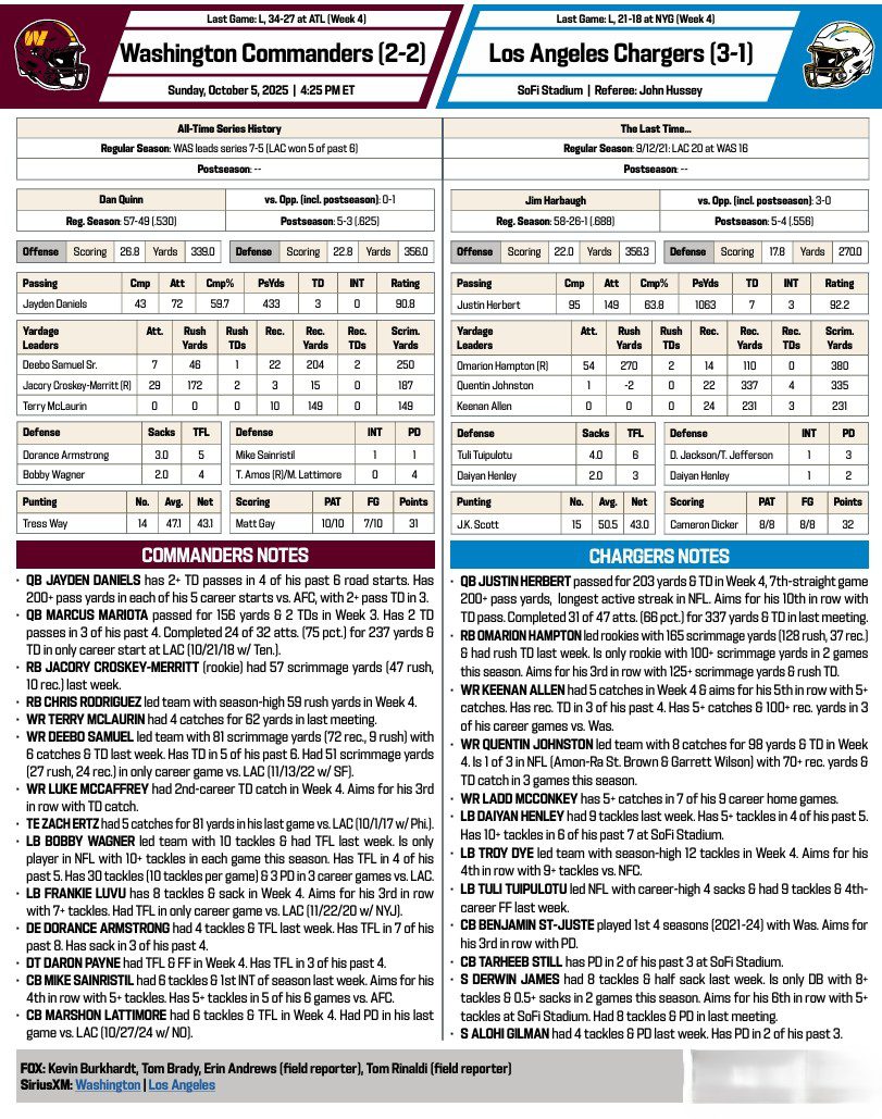 Week 5 NFL Preview: Commanders on a West Coast trip to LA Chargers, 4:25 PM Posted on 7 months ago by admin By Lydia Jane Allison COURTESY NFL COMMUNICATIONS Post navigation Previous article Week 5 NFL Preview: Lions with a rare visit to Cincinnati and the Bengals, 4:25 PMNext article Week 5 NFL Preview: Sunday Night Football on NBC, Patriots invade the Bills, 8:20 PM