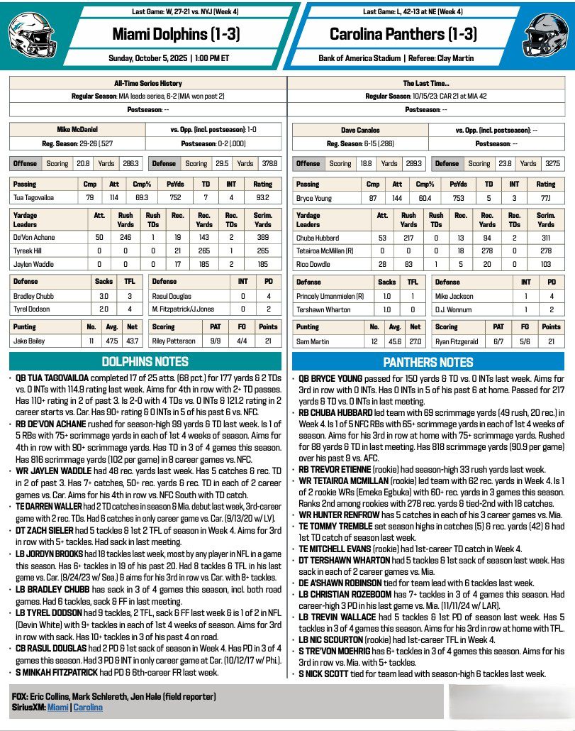 Week 5 NFL Preview: Dolphins visit the Panthers, 1 PM Posted on 7 months ago by admin By Lydia Jane Allison COURTESY NFL COMMUNICATIONS Post navigation Previous article Week 5 NFL Preview: Texans invade the Ravens, who are without QB Lamar Jackson, 1 PMNext article Week 5 NFL Preview: Raiders invade Circle City and the Colts, 1 PM