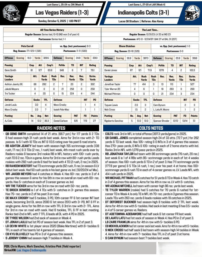 Week 5 NFL Preview: Raiders invade Circle City and the Colts, 1 PM Posted on 7 months ago by admin By Lydia Jane Allison COURTESY NFL COMMUNICATIONS Post navigation Previous article Week 5 NFL Preview: Dolphins visit the Panthers, 1 PMNext article Week 5 NFL Preview: NY Giants visit the winless Saints, 1 PM