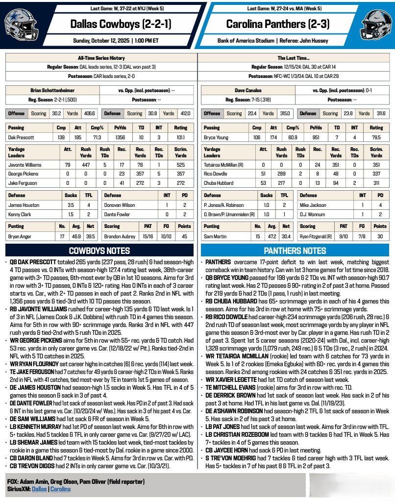 Week 6 NFL Preview: Cowboys invade the Panthers, 1 PM Posted on 6 months ago by admin By Lydia Jane Allison COURTESY NFL COMMUNICATIONS Post navigation Previous article Week 6 NFL Preview: LA Rams with a rare visit to Baltimore and the Ravens, 1 PMNext article Week 6 NFL Preview: Cardinals travel to the Colts, 1 PM