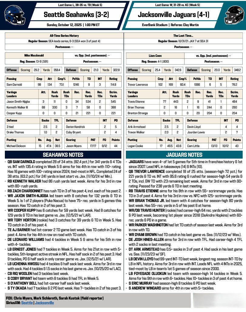 Week 6 NFL Preview: Seahawks at the Jaguars, 1 PM Posted on 6 months ago by admin By Lydia Jane Allison COURTESY NFL COMMUNICATIONS Post navigation Previous article Week 6 NFL Preview: Cardinals travel to the Colts, 1 PMNext article Week 6 NFL Preview: LA Chargers in sunny Miami playing the Dolphins, 1 PM