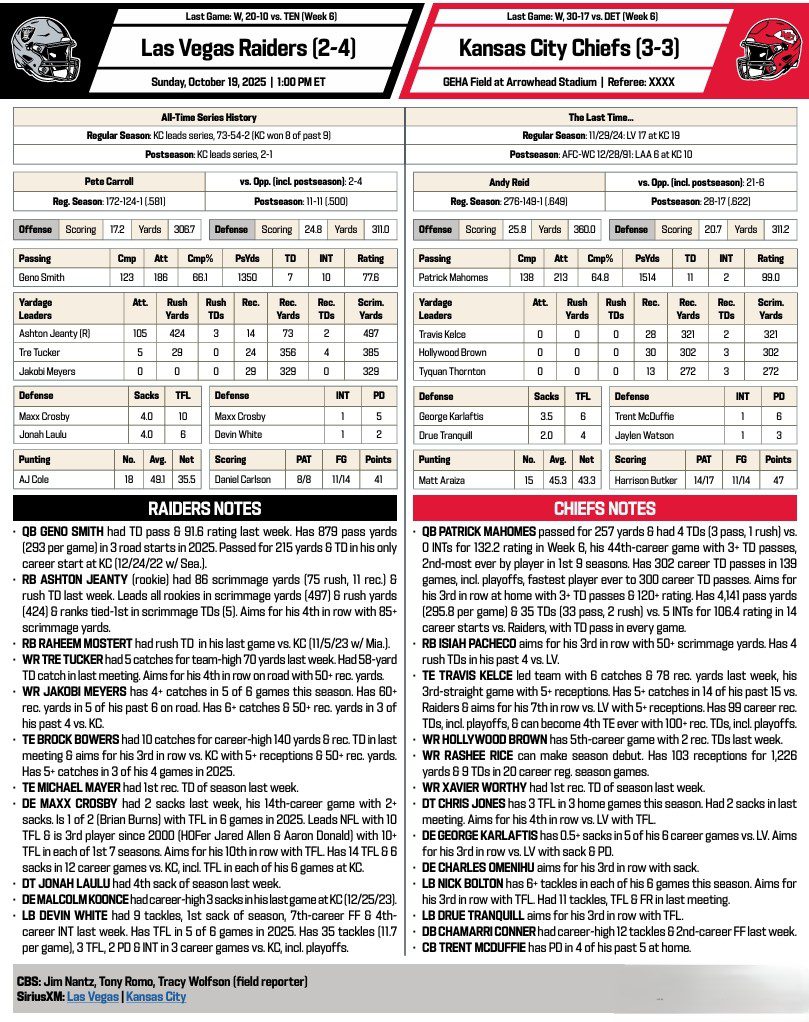 Week 7 NFL Preview: AFC West battle with two struggling teams, Raiders at the Chiefs, 1 PM Posted on 6 months ago by admin By Lydia Jane Allison COURTESY NFL COMMUNICATIONS Post navigation Previous article Week 7 NFL Preview: two 1-5 teams with coaches on the hot seat meet in Cleveland, Dolphins at Browns, 1 PMNext article Week 7 NFL Preview: Eagles invade the Twin Cities for matchup with Vikings, 1 PM