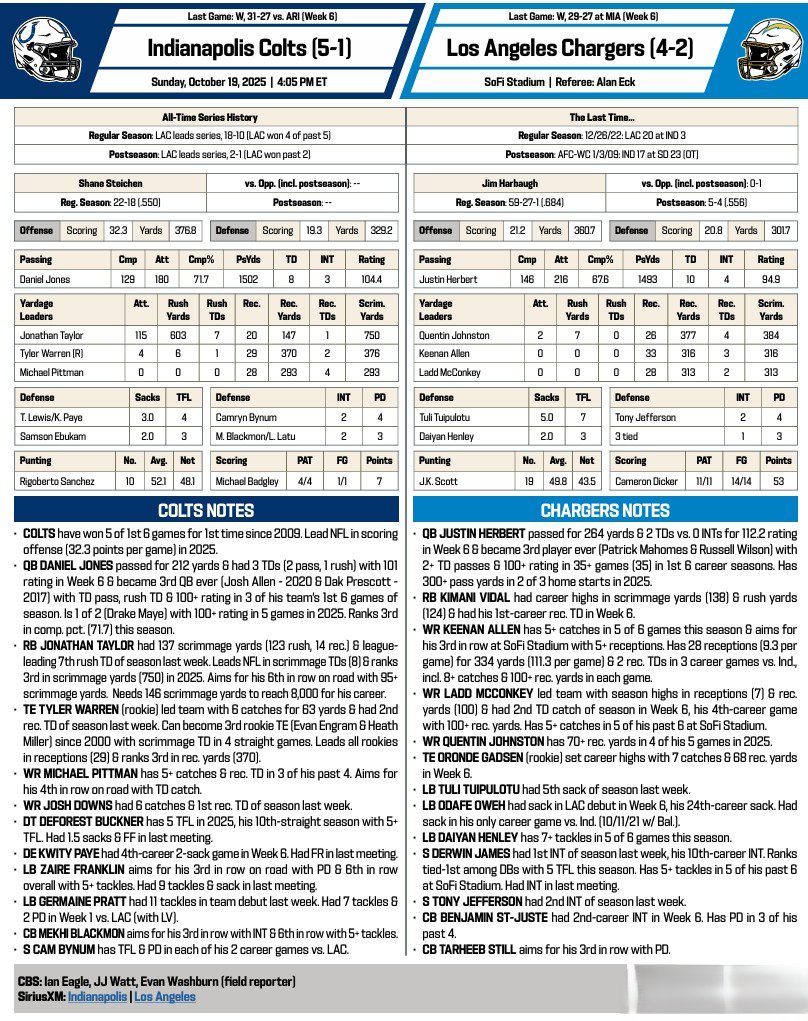 Indianapolis Colts (5-1) at Los Angeles Chargers (4-2) (Sunday, 4:05 p.m. ET, CBS): The Colts enter Week 7 with the best record in the AFC and have won at least five of their first six games for the first time since 2009. Indianapolis leads the NFL in scoring offense this season (32.3 points per game).