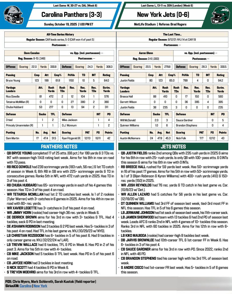 Week 7 NFL Preview: Improved Panthers do not want to lose at the winless NY Jets, 1 PM Posted on 6 months ago by admin By Lydia Jane Allison COURTESY NFL COMMUNICATIONS Post navigation Previous article Week 7 NFL Preview: Eagles invade the Twin Cities for matchup with Vikings, 1 PMNext article Week 7 NFL Preview: Patriots head coach Mike Vrabel goes up against old team, The Titans on road, 1 PM